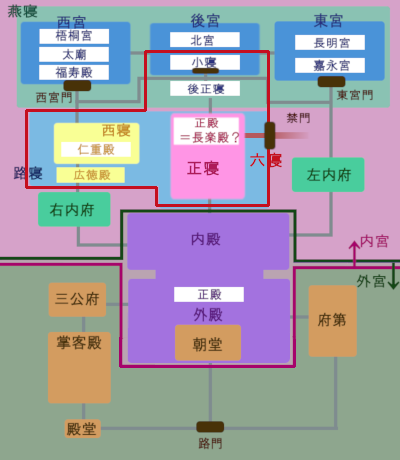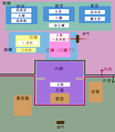 禁門を入ったところは路寝なのに、禁門が燕寝の奥まったところにあるというのも腑に落ちず。
